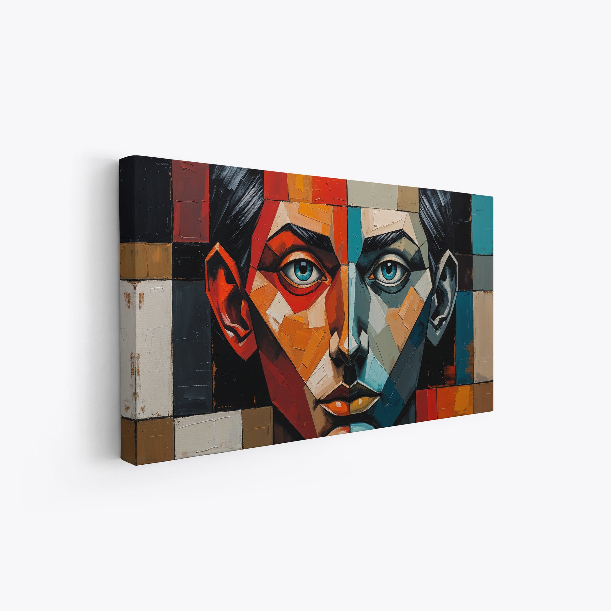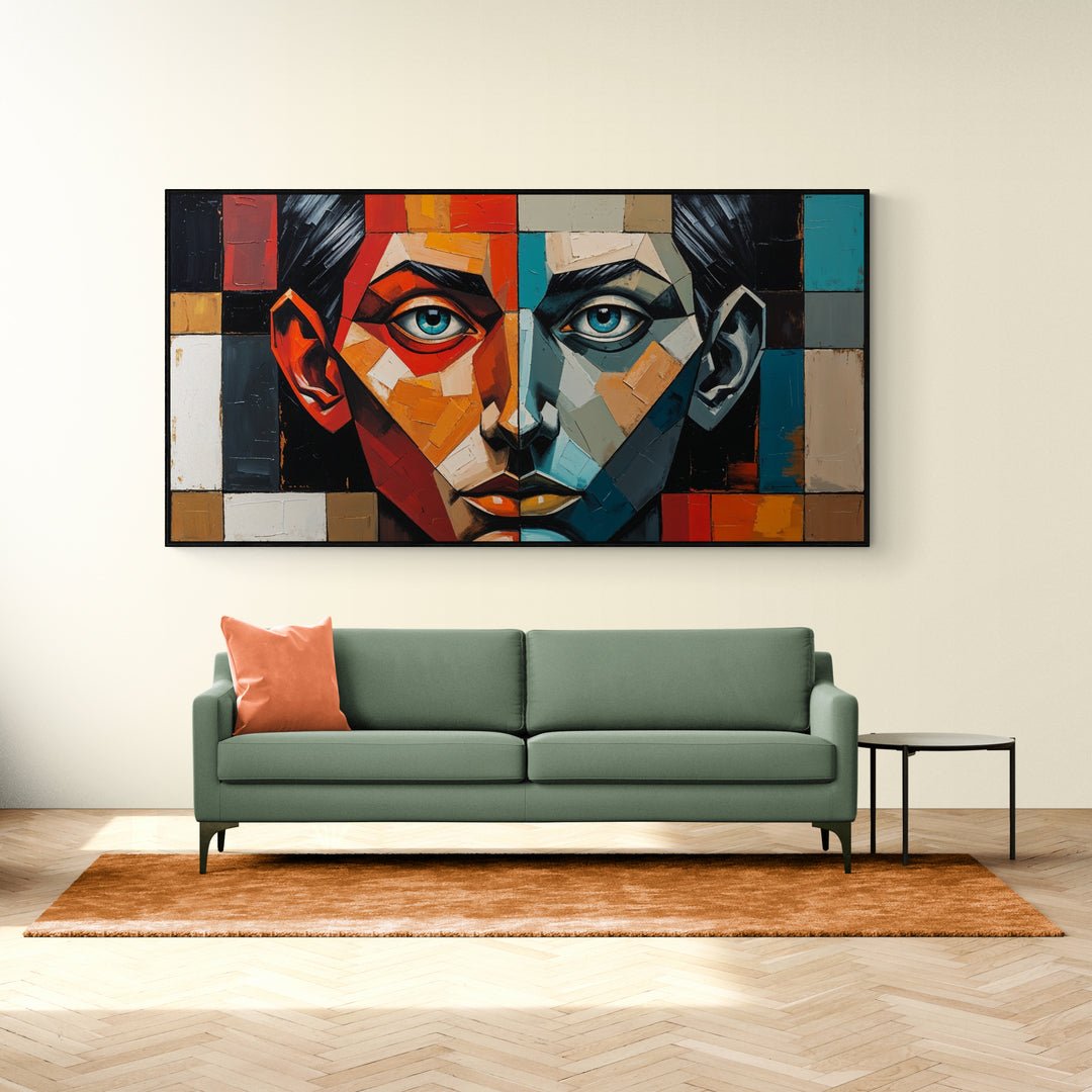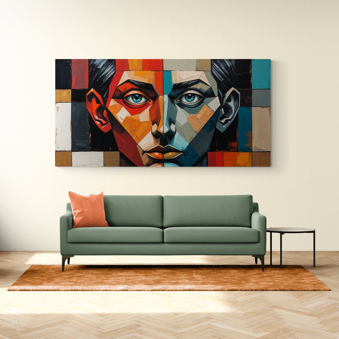 "Equilibrio fragile" è un’opera astratta moderna in stile cubista che rappresenta la tensione costante tra due forze interiori opposte. Il volto centrale del dipinto è perfettamente diviso in due metà speculari: una calda, vibrante, in tonalità rosso, arancio e beige; l’altra fredda e riflessiva, in sfumature di blu, turchese e grigio.