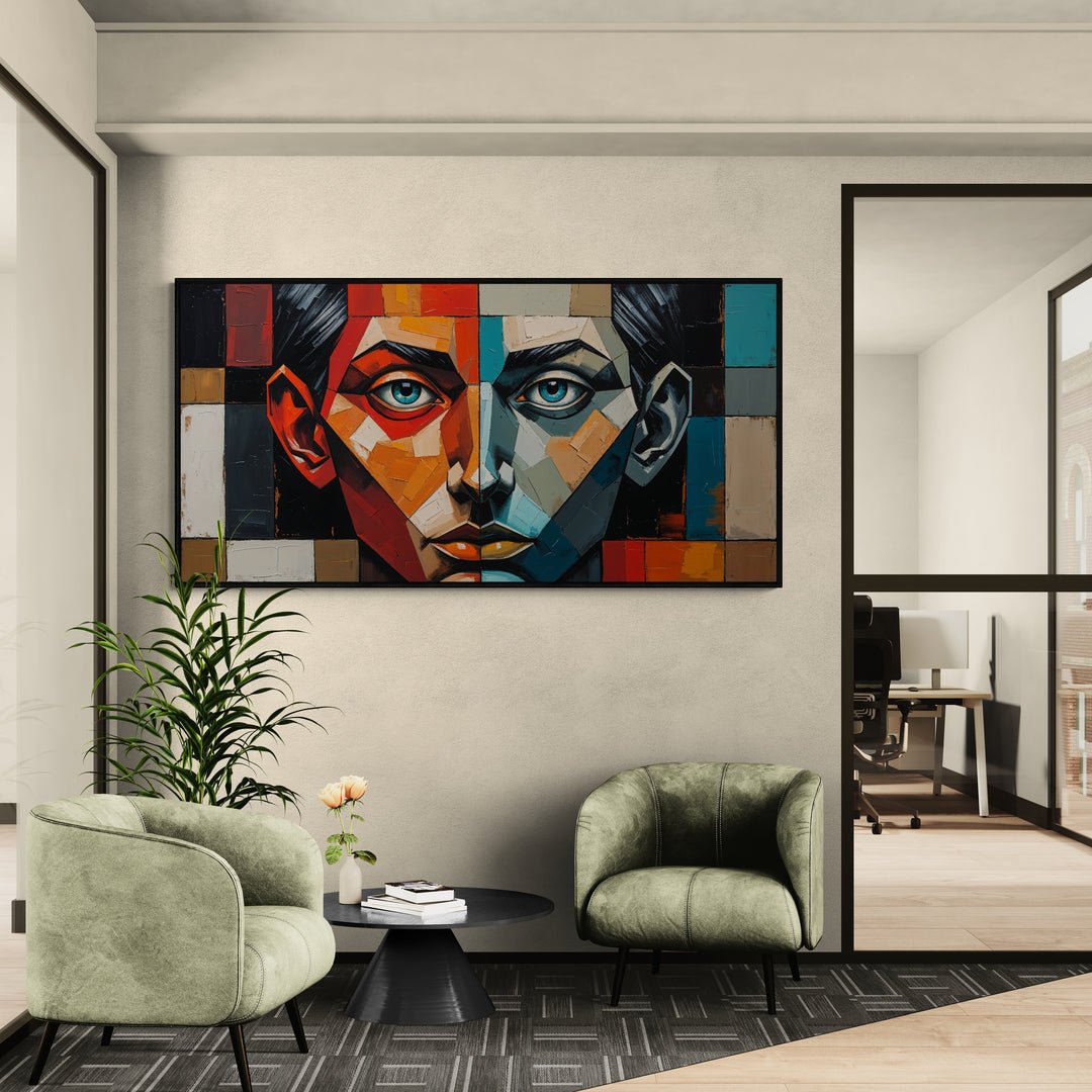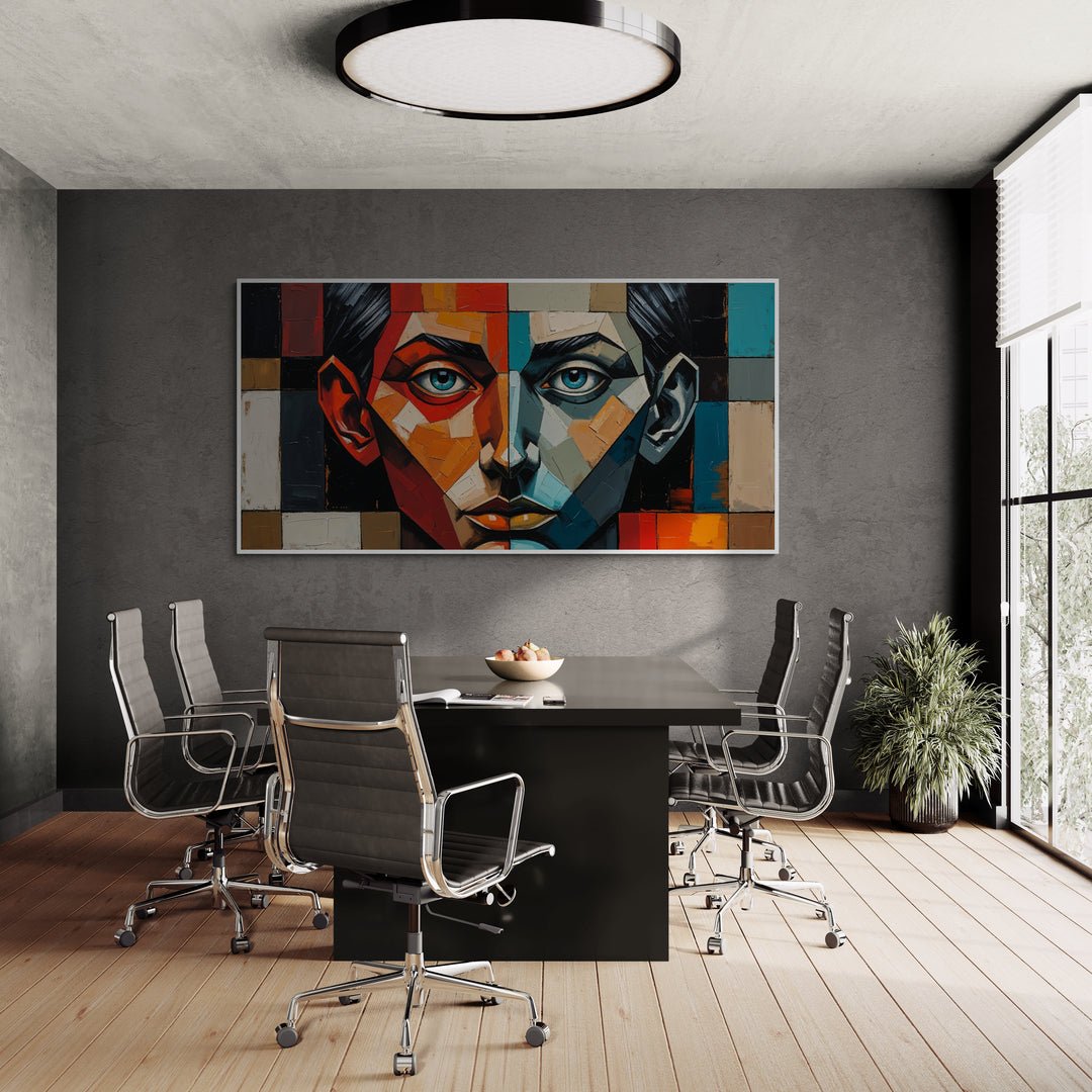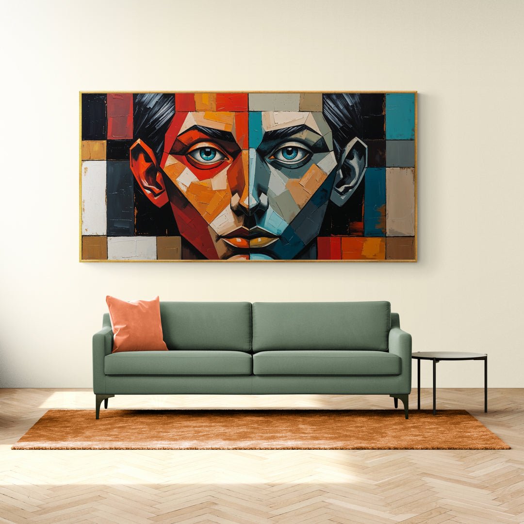 "Equilibrio fragile" è un’opera astratta moderna in stile cubista che rappresenta la tensione costante tra due forze interiori opposte. Il volto centrale del dipinto è perfettamente diviso in due metà speculari: una calda, vibrante, in tonalità rosso, arancio e beige; l’altra fredda e riflessiva, in sfumature di blu, turchese e grigio.